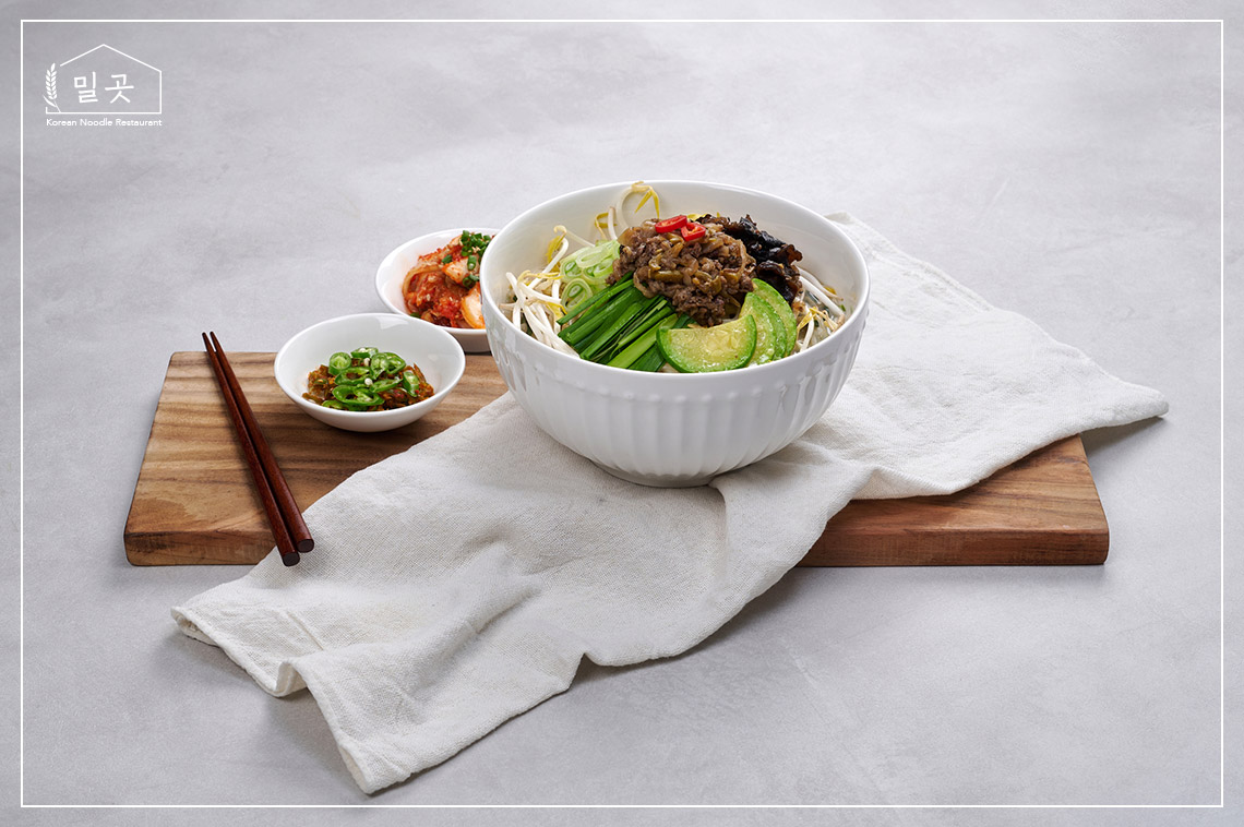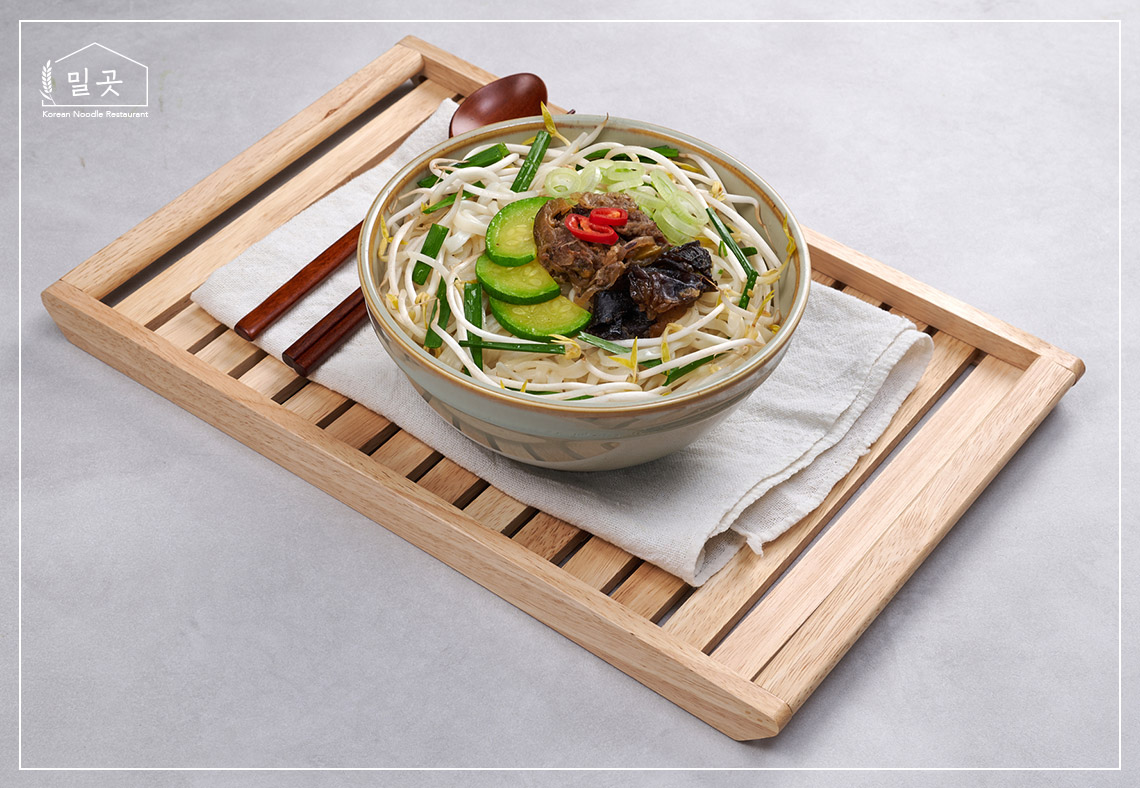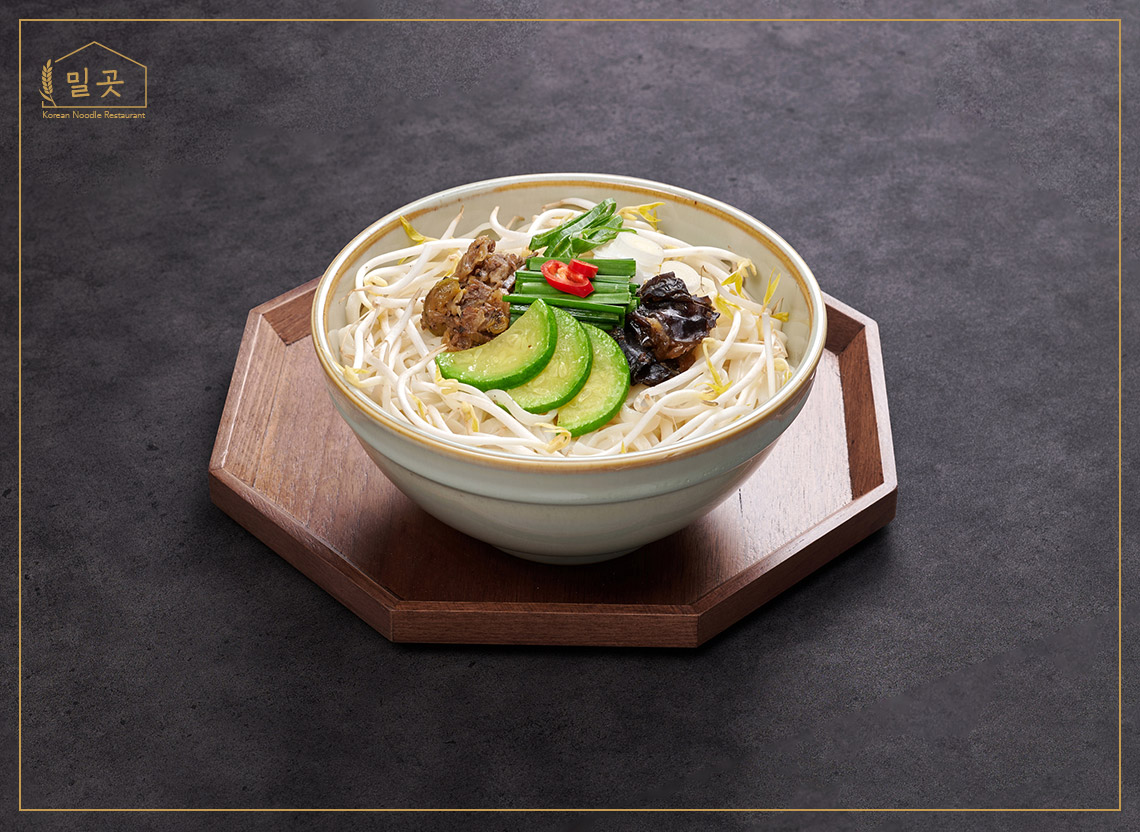 밀곳 칼국수는 사골,고기,야채 육수 순으로 조화를 이룹니다. 사골의 깊은 맛, 고기의 고소함, 야채의 진한맛이 어우러져 깊고 진한 여운의 맛을 느낄수 있습니다. 그리고 소고기, 애호박, 양파, 버섯, 숙주, 부추, 대파를 이용하여 칼국수의 단순한 영영섭취의 단점을 보완하고자 했습니다. 고명의 불맛을 통해 환상적인 풍미 느낄수 있으며, 부드러운 면은 전통칼국수의 진가를 맛볼수 있습니다.